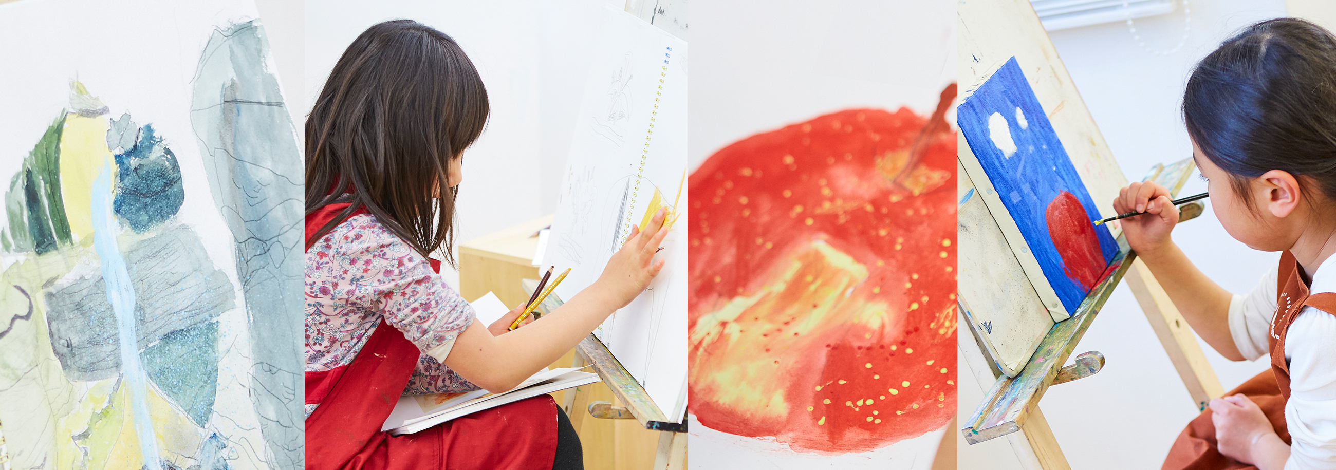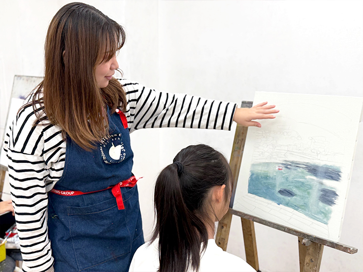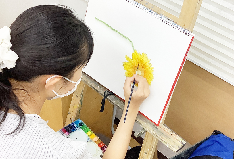 - 画材やモチーフは大人と同様。制作時にはイーゼルも使用します。