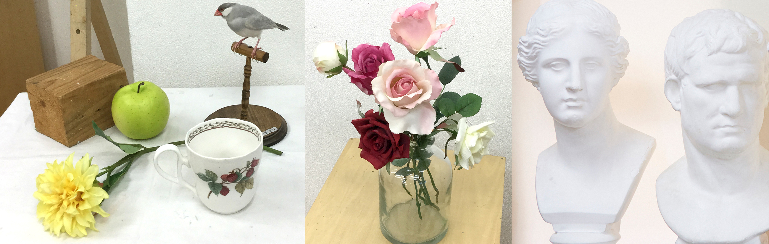 - 初心者も描きやすい幾何形体や石膏像から、ご自宅では揃えにくい剥製・アンティーク雑貨など描きたくなるモチーフがあります。参考になる資料や本もご用意しています。旅の写真、ペットの写真などから制作していただくこともできます。